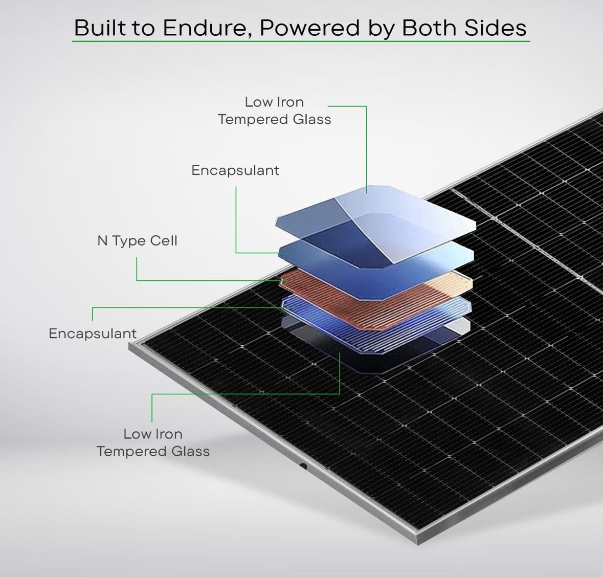 • Bifacial Design: Captures sunlight from both the front and rear, increasing energy output.